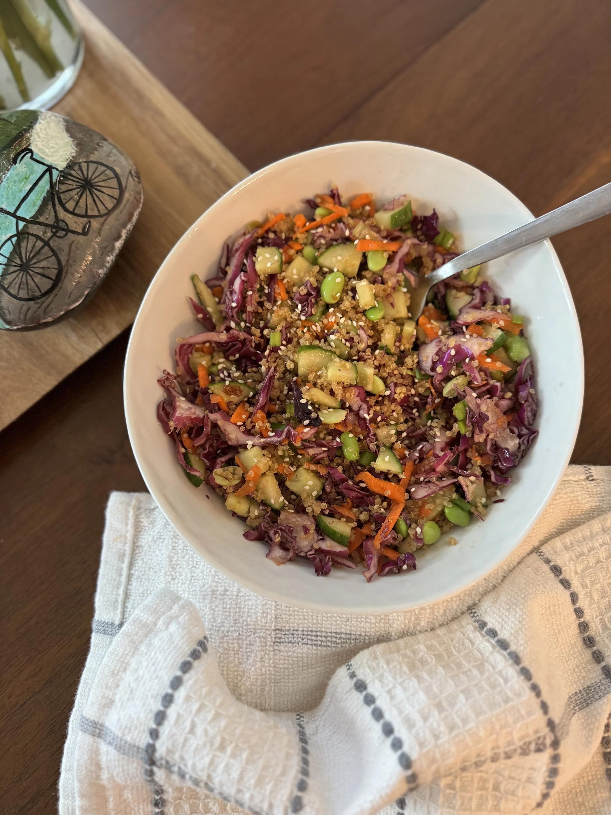 Protein: Use your palm size as a guide for protein portions. This typically equates to about 20-30 grams of protein, which is ideal for muscle repair and growth. For ex. a palm-sized piece of chicken, fish, tempeh, or legumes.